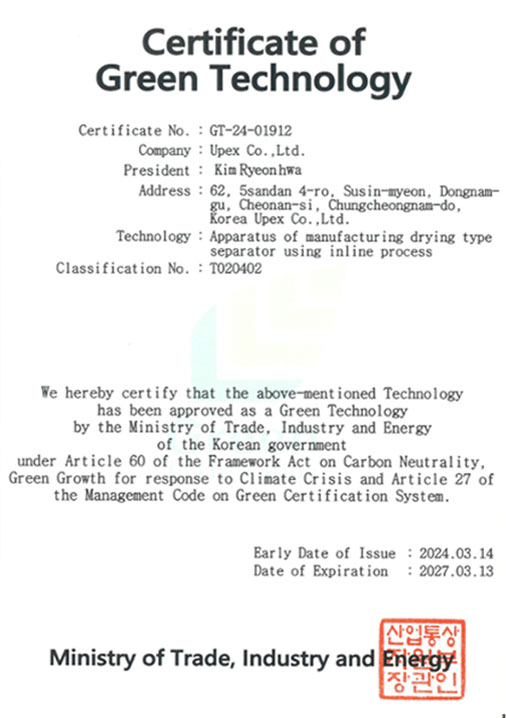 U-PEX의 친환경성은 산업통상자원부에서 발급한 녹색기술 인증을 통해 검증되었습니다.