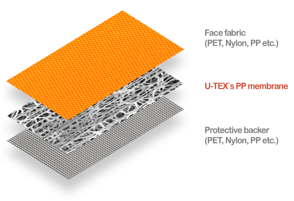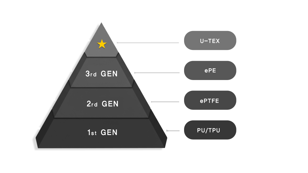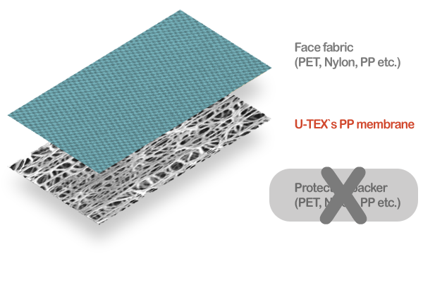 U-TEX는 전 세계에서 가장 얇은 두께로 양산된 이축 연신 ePP 멤브레인을 사용한 제품입니다. (두께 7μm - 12μm)